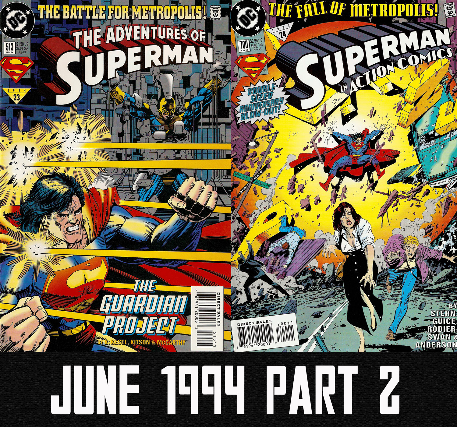 This time out Mike and Jeff finish off the Superman books with a cover date of June 1994. Exciting and action packed are two words that would adequately describe the comics they talk about. Historic would be another way to describe at least one of the books. In Adventures of Superman #513 the Battle For Metropolis ends as Superman fights the forces of Team Luthor in the very bowels of Cadmus. Then, in Action Comics #700 the battle is over and the Fall of Metropolis begins! Lex Luthor’s final gambit is put into play and it is up to Superman, Supergirl and Superboy to try and save the city as Pete Ross and Lana Lang walk down the aisle in Smallville! Buildings fall! Long time supporting characters die! A former nemesis lends Superman a hand! This one has it all, folks. After all that the boys look at what else was going on in the DCU including the happenings from Steel #5.